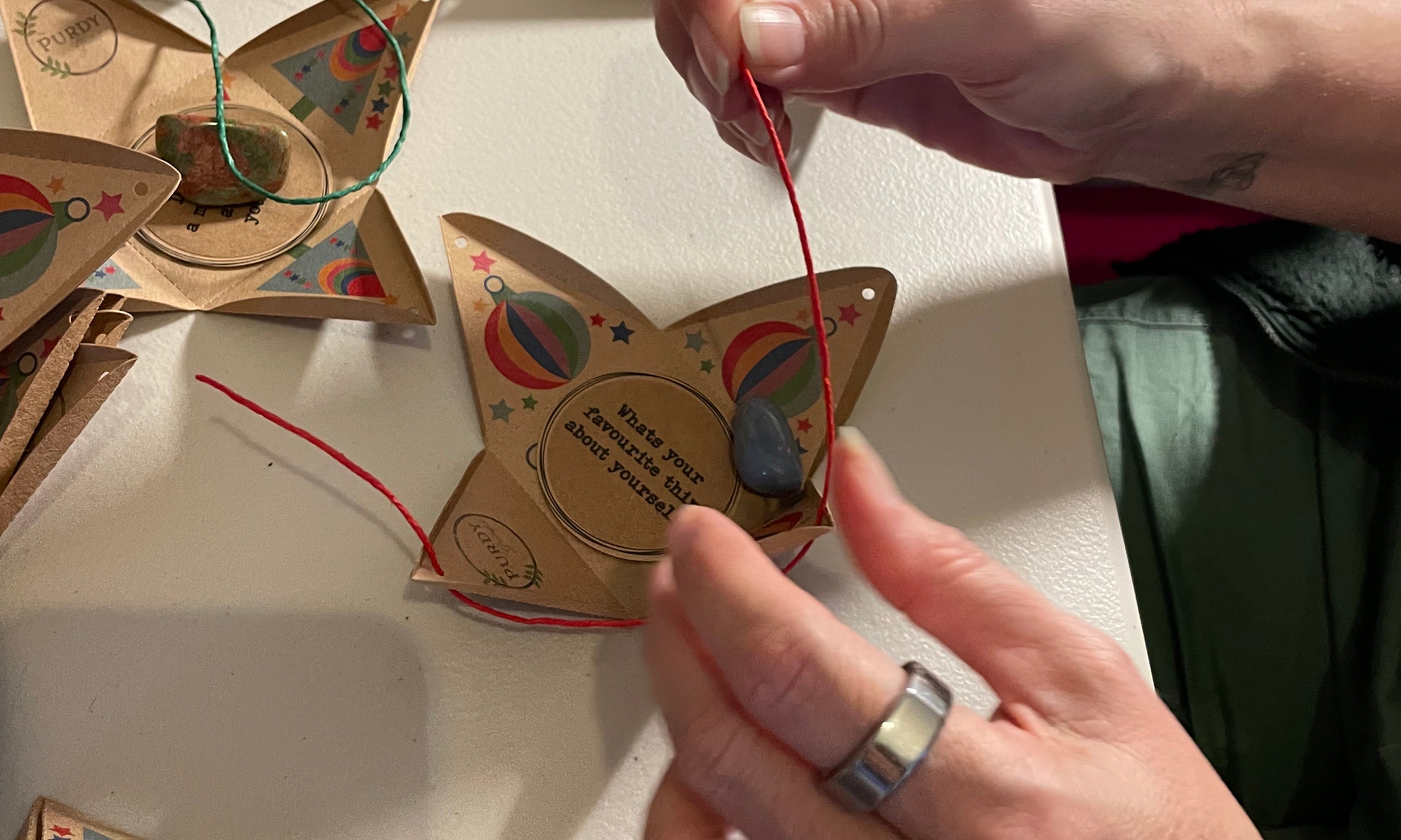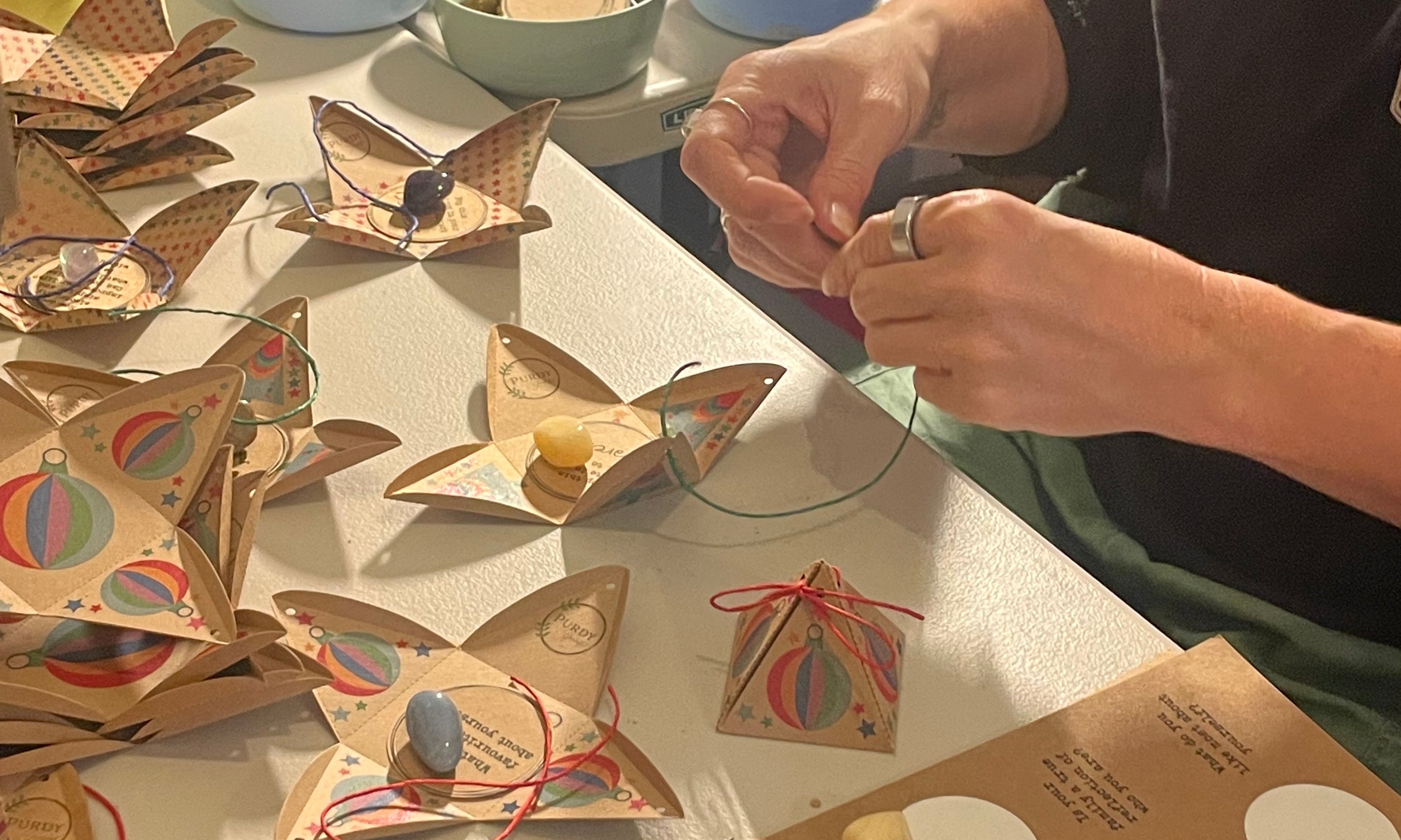 BenBens are eco-friendly pyramid boxes containing a thought-provoking question and a crystal. They are designed to inspire shared stories and learning through gratitude, connection, and presence.